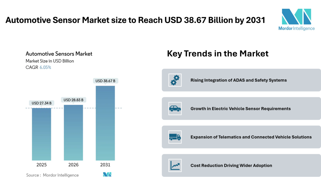 According to Mordor Intelligence, the automotive sensor market size was valued at USD 27.34 billion in 2025 and is estimated to grow to USD 28.83 billion in 2026, reaching USD 38.67 billion by 2031, registering a CAGR of 6.05% during the forecast period. This steady automotive sensor market growth reflects the increasing integration of sensors across modern vehicles, where safety, efficiency, and connectivity are becoming standard expectations rather than premium features.